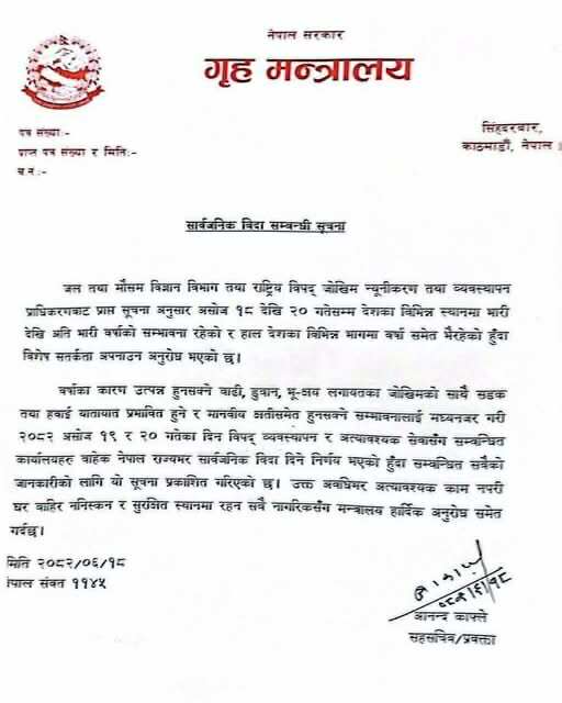 जल तथा मौसम विज्ञान विभाग र राष्ट्रिय विपद् जोखिम न्यूनीकरण तथा व्यवस्थापन प्राधिकरणबाट प्राप्त सूचनाअनुसार असोज १८ देखि २० गतेसम्म देशका विभिन्न स्थानमा भारीदेखि अति भारी वर्षा हुने सम्भावना रहेको हुँदा नेपाल सरकारले असोज १९ र २० गते सार्वजनिक बिदा दिने निर्णय गरेको छ।