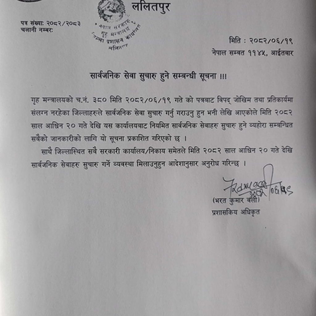 यसैगरी, ललितपुर जिल्ला प्रशासन कार्यालयका सूचना अधिकारी भरतकुमार वलीले पनि सूचना जारी गर्दै ललितपुर जिल्लाका सबै प्रकारका कार्यालय खुल्ने र सेवा सुरु गर्ने सूचना जारी भएको जानकारी दिनु भएको छ ।
