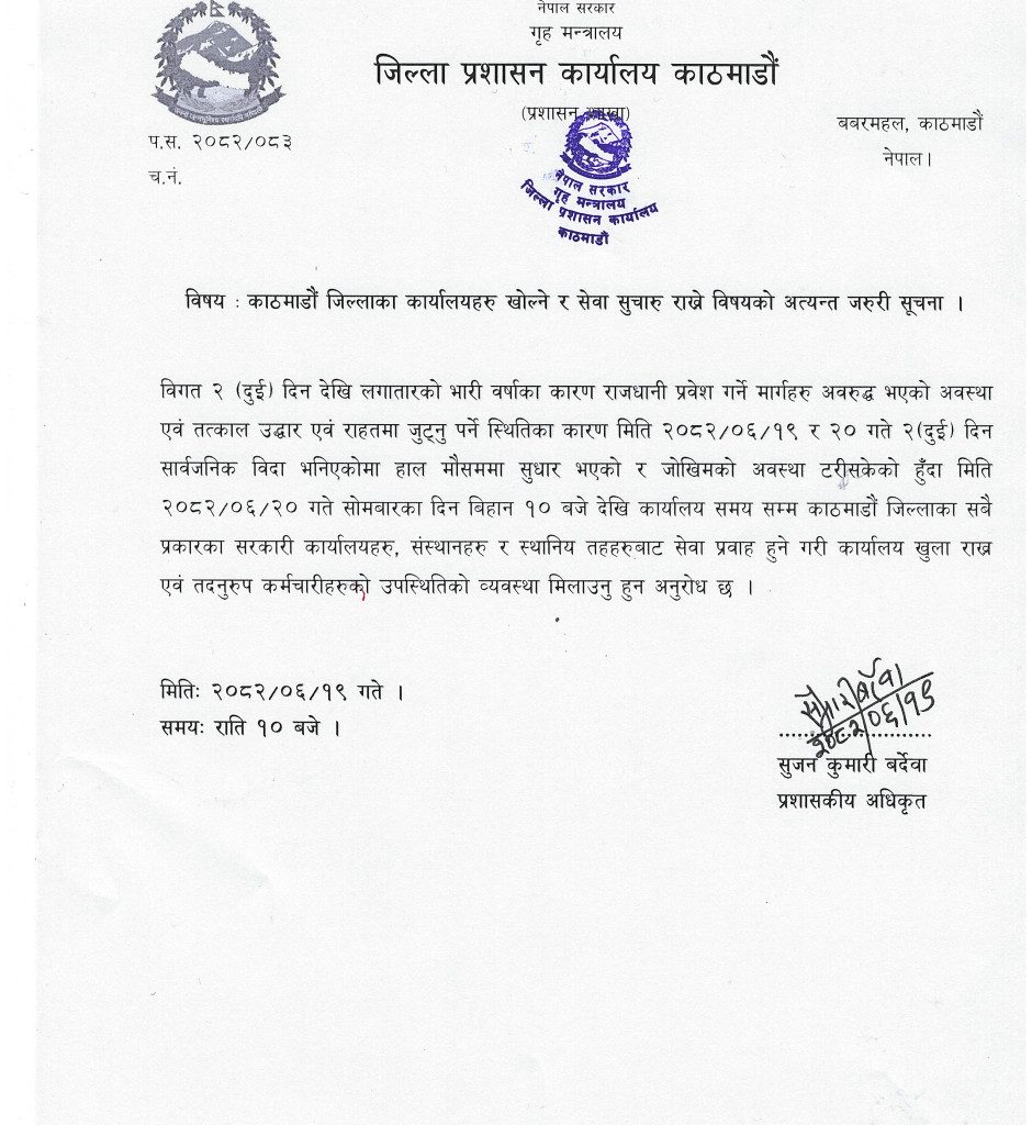 सूचनामा भनिएको छ, ‘‘विगत २ (दुई) दिन देखि लगातारको भारी वर्षाका कारण राजधानी प्रवेश गर्ने मार्गहरु अवरुद्ध भएको अवस्था एवं तत्काल उद्धार एवं राहतमा जुट्नु पर्ने स्थितिका कारण मिति २०८२–०६–१९ र २० गते २ (दुई) दिन सार्वजनिक विदा भनिएकोमा हाल मौसममा सुधार भएको र जोखिमको अवस्था टरीसकेको हुँदा मिति २०८२–०६–२० गते सोमबारका दिन बिहान १० बजे देखि कार्यालय समय सम्म काठमाडौं जिल्लाका सबै प्रकारका सरकारी कार्यालयहरु, संस्थानहरू र स्थानिय तहहरुबाट सेवा प्रवाह हुने गरी कार्यालय खुला राख एवं तदनुरुप कर्मचारीहरुको उपस्थितिको व्यवस्था मिलाउनु हुन अनुरोध छ ।’’