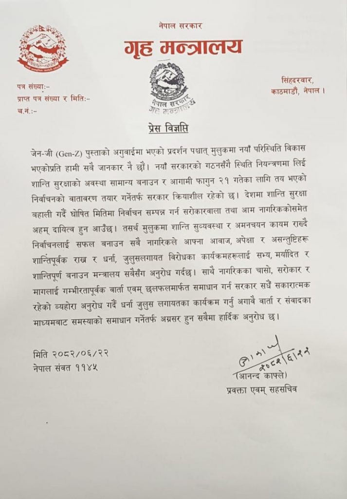 नयाँ सरकारको गठनसँगै स्थिति नियन्त्रणमा लिई शान्तिसुरक्षाको अवस्था सामान्य बनाउन र आगामी फागुन २१ गतेका लागि तय भएको निर्वाचनको वातावरण तयार गर्नेतर्फ सरकार क्रियाशील रहेको मन्त्रालयका सहसचिव एवं प्रवक्ता आनन्द काफ्लेद्वारा जारी विज्ञप्तिमा उल्लेख छ ।