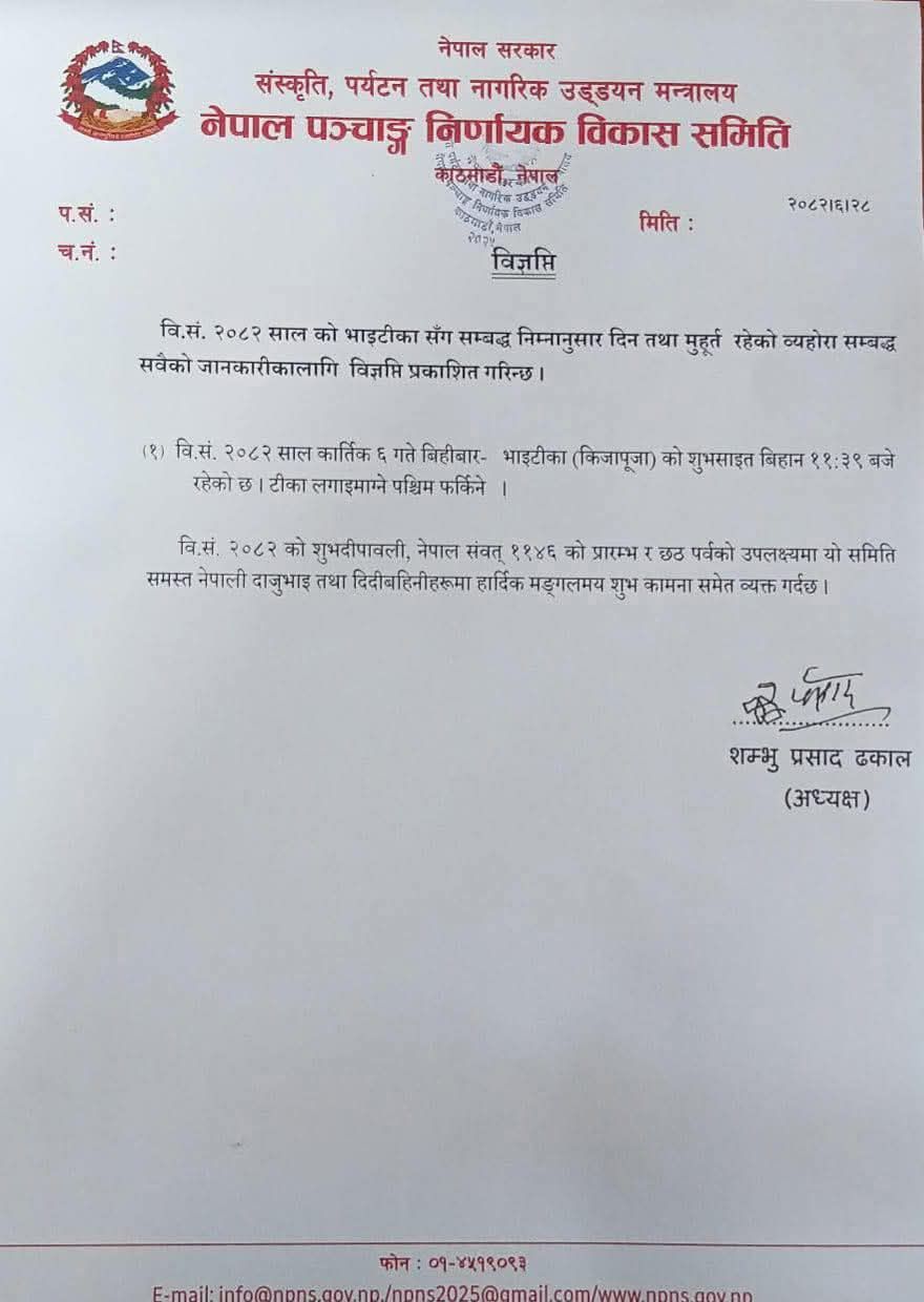 नेपाल पञ्चाङ्ग निर्णायक विकास समितिले यस वर्षको भाइटीकाको उत्तम साइत सार्वजनिक गरेको छ ।