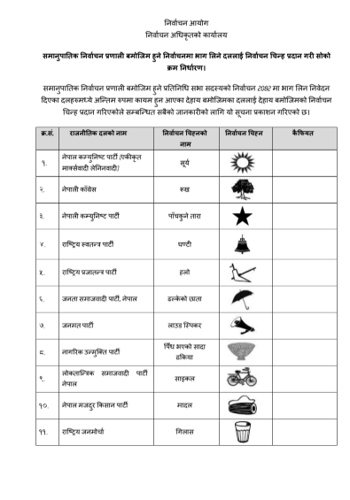 निर्वाचन आयोगले आगामी फागुन २१ गतेका लागि तय भएको प्रतिनिधि सभाको निर्वाचनमा समानुपातिकतर्फको निर्वाचनमा भाग लिने दललाई निर्वाचन चिन्ह प्रदान गरेको छ ।