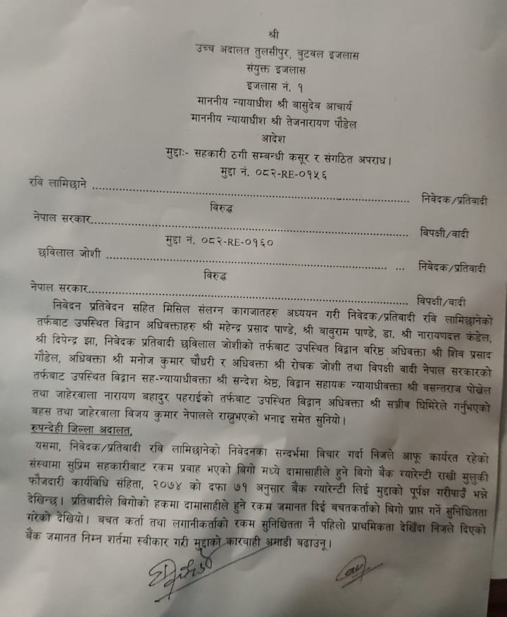 उच्च अदालत तुलसीपुर बुटवल इजलासले रास्वपा सभापति रवि लामिछानेलाई थुनामुक्त गर्न आदेश दिएको छ । उच्च अदालत बुटवलका सूचना अधिकारी रामबहादुर कुँवरका अनुसार रविलाई २ करोड ६८ लाख रुपियाँ जमानत राखेर थुनामुक्त गर्न आदेश दिएको हो ।