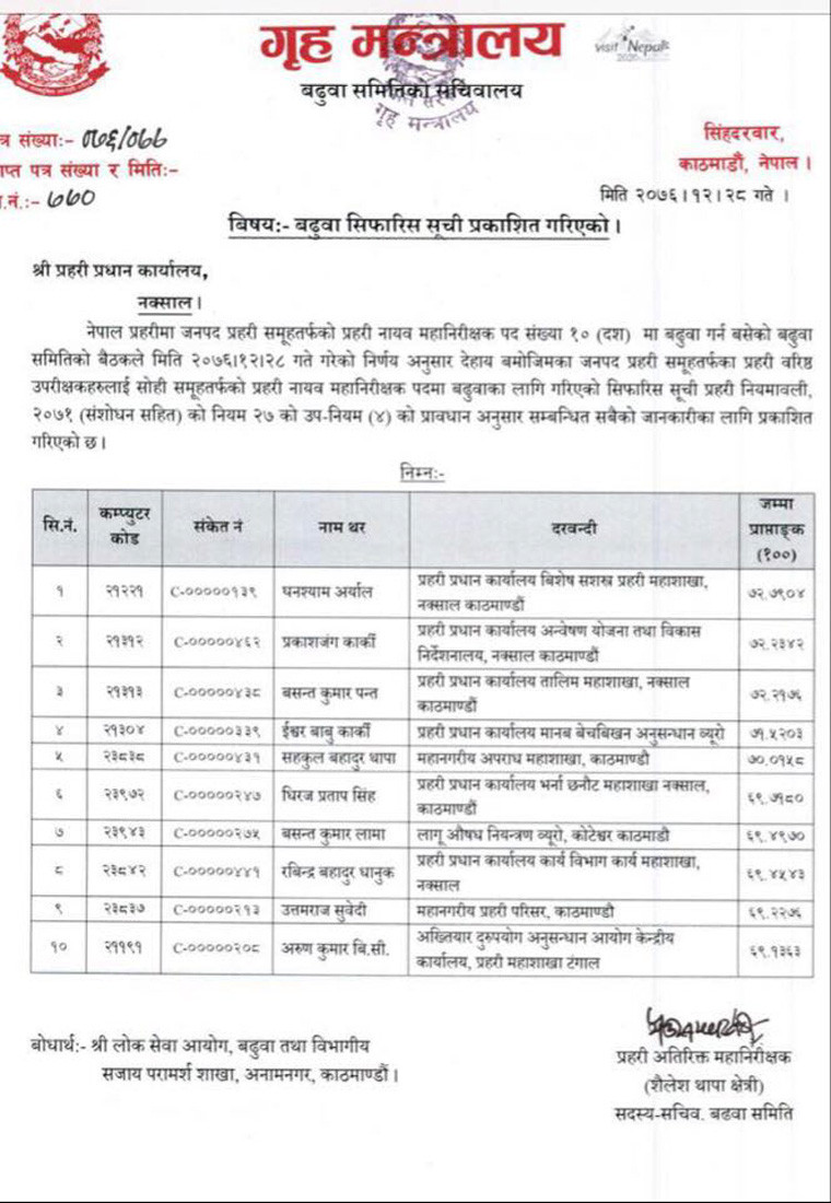 गृहसचिव महेश्वर न्यौपानेको अध्यक्षतामा रहेको बढुवा सिफारिस समितीले एसएसपीहरु घनश्याम अर्याल, प्रकाशजंग कार्की, बसन्तकुमार पन्त, ईश्वरबाबु कार्की, सहकुलबहादुर थापा, धिरजप्रताप सिंह, बसन्तकुमार लामा, रबिन्द्रबहादुर धानुक, उत्तमराज सुवेदी र अरुणकुमार बि.सी.लाई सिफारिस गरेकाे हाे ।