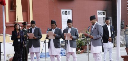 राष्ट्रपति पौडेलले राष्ट्रपति कार्यालय शीतल निवासमा आज आयोजित विशेष समारोहमा नवनियुक्त मन्त्रीहरू अनिलकुमार सिन्हा, महावीर पुन, मदनकुमार परियार र जगदीश खरेललाई...