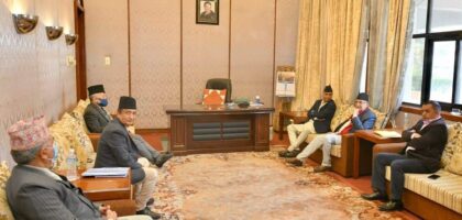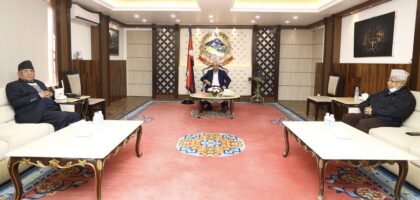 समसामयिक राजनीतिक विषयमा परामर्श गर्न प्रधानमन्त्री शेरबहादुर देउवा, नेकपा (माओवादी केन्द्र)का अध्यक्ष पुष्पकमल दाहाल ‘प्रचण्ड’ र नेकपा (एकीकृत समाजवादी)का अध्यक्ष माधवकुमार...